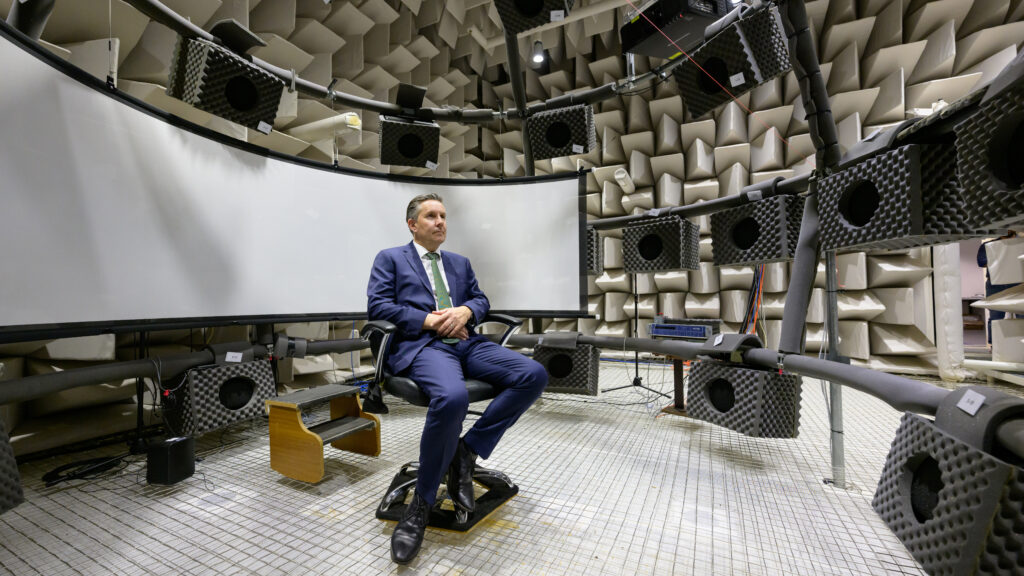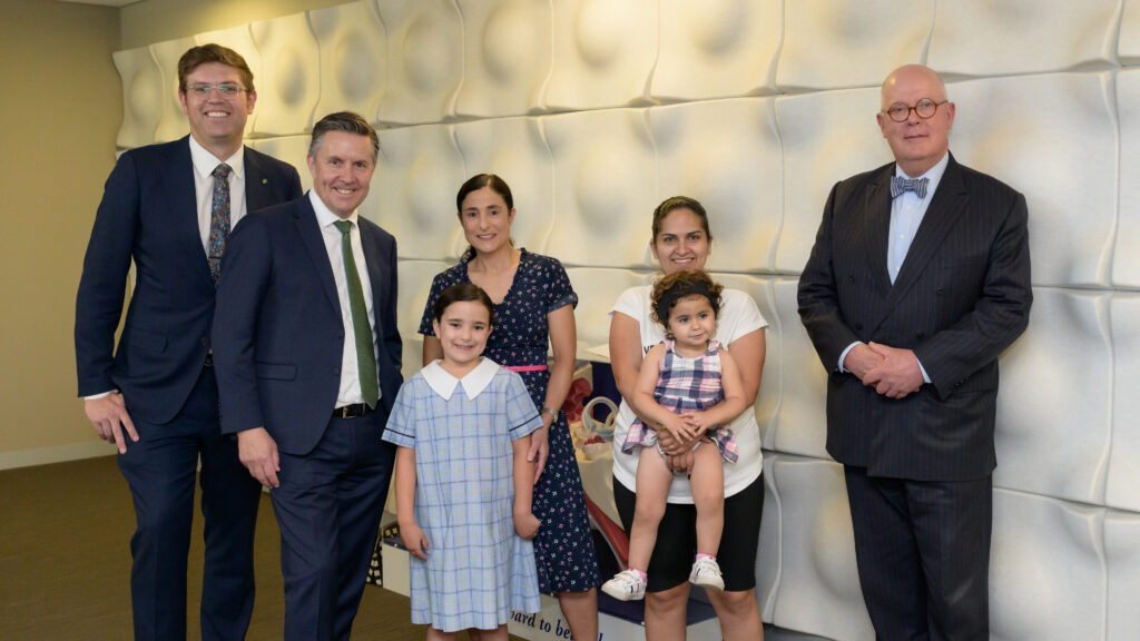 Mr Butler was accompanied by Macquarie University Vice-Chancellor and President, Professor S. Bruce Dowton, and Deputy Vice‑Chancellor, Research, Professor Sakkie Pretorius. The group toured the AHH’s state-of-the-art facilities, including the anechoic chamber, and met two families from The Shepherd Centre and NextSense to learn about their hearing health care journey.